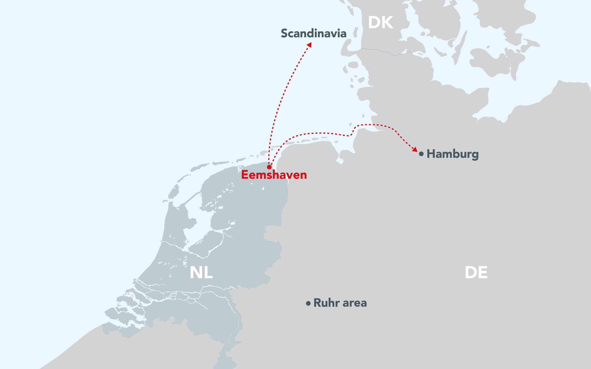 Vanuit Eemshaven vertrekken schepen rechtstreeks naar Duitsland, Scandinavië en de Baltische staten. Het is de kortste zeeweg naar Noorwegen, met aan de westzijde bovendien een verbinding richting het Verenigd Koninkrijk.
